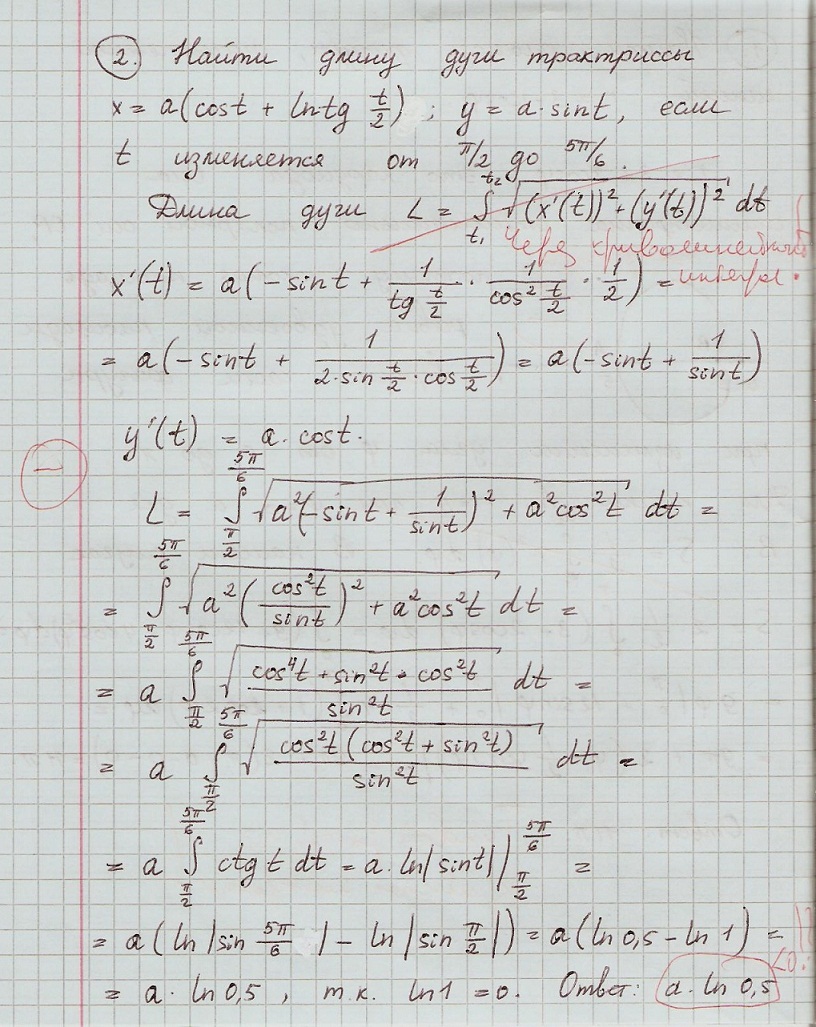 Всем привет. В одном из заданий типовика нужно посчитать длину дуги трактрисы через криволинейный (!) интеграл. Подскажите, что я сделал не так. Разве формула для вычисления длины дуги будет иметь какой-то другой вид? И кстати где тут ошибка зарыта?