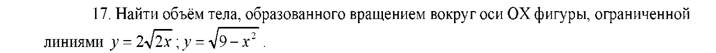 Найти объем тела, образованного вращением вокруг оси ОХ фигуры, ограниченной линиями y=2*√2x и y=√9-x^2