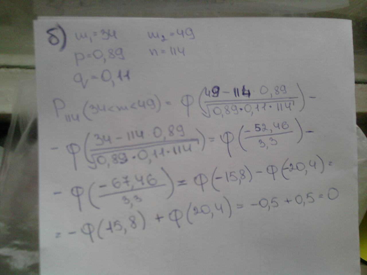 Вероятность наступления некоторого события в каждом из 114 независимых испытаний равна 0,89. Определить вероятность того, что событие: а) наступит ровно 79 раз; б) не наступит от 34 до 49 раз; в) наступит не менее 74 раз.