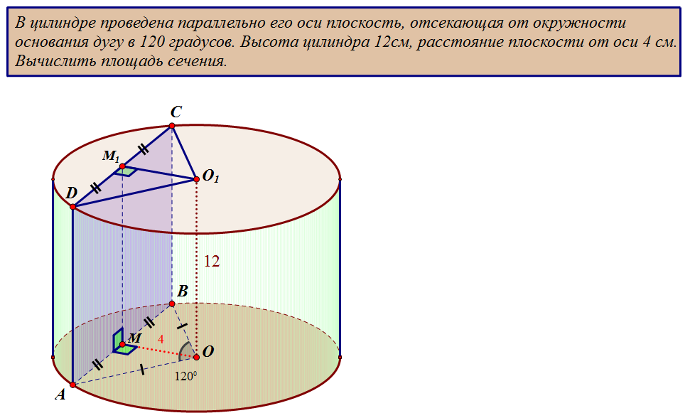 В цилиндре проведена параллельно его оси плоскость, отсекающая от окружности основания дугу в 120 градусов. Высота цилиндра 12см, расстояние плоскости от оси 4 см. Вычислить площадь сечения.