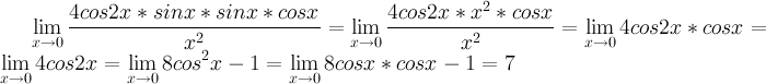 Здесь можно (хотя это не рекомендуется, но мне везет часто) воспользоваться эквивалентными бесконечно малыми (9x^2-x^)/x^2 =8