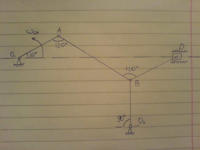 Условие: стержни О1А и О2А, соединенные со стержнем АВ посредством шарниров А и В, могут вращаться вокруг неподвижных точек О1 и О2, оставаясь в плоскости рисунка. Стержень ВД, присоединенный в точке В, перемещается в этой же плоскости и приводит в движение вдоль горизонтальный направляющих ползун Д. Для положения механизма, указанного на рисунке определить ускорение точки В, а также угловую скорость и угловое ускорение звена ВД, если извесно: Woa=1рад/с=const, О1А=ВО2=30 см, ВД=20 см.