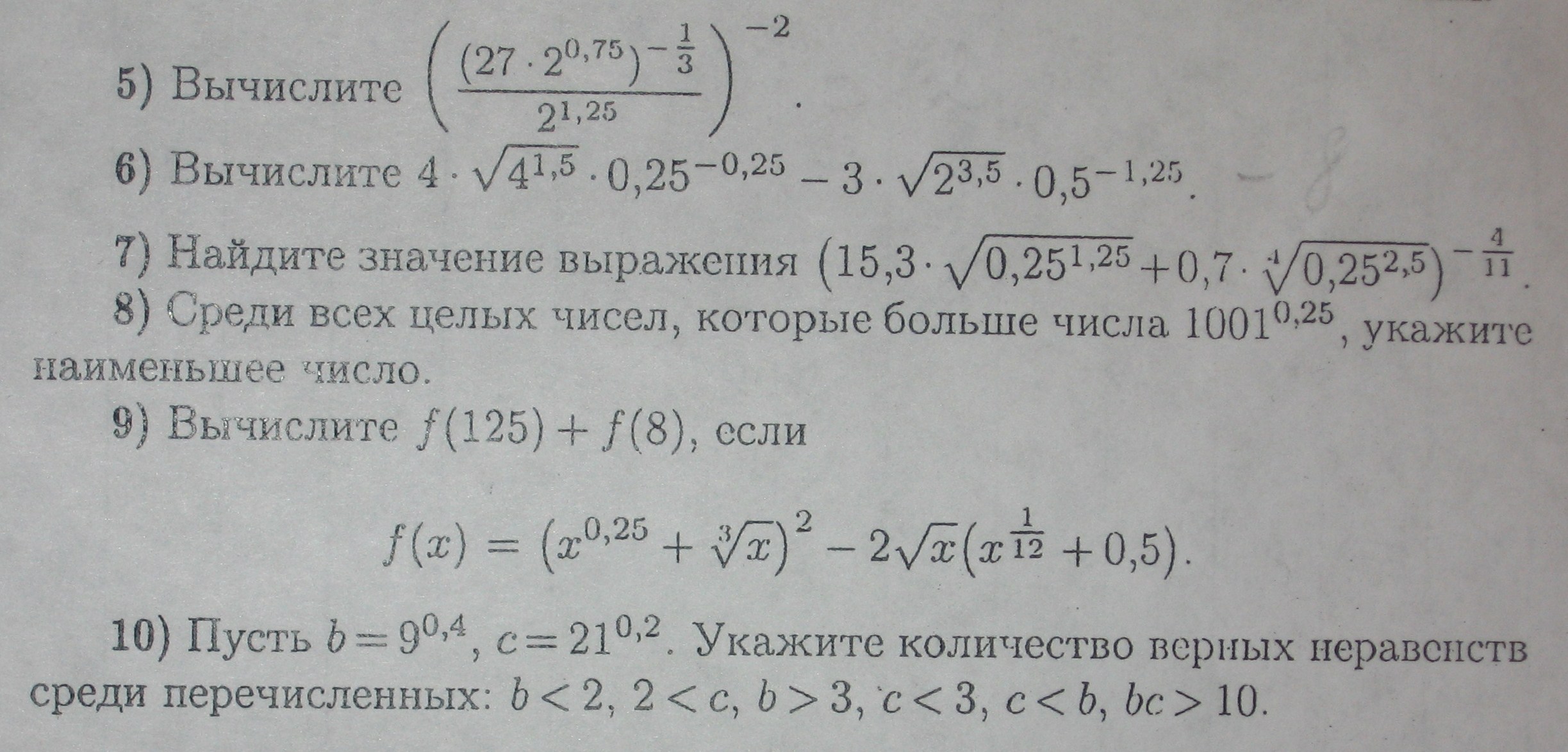 Нажмите для просмотра прикрепленного файла 5) получилось 72 6) получилось -8 7) все сократилось до (15,3*(2^-2,5/2) + 0,7*(2^-5/2))^-4/11 как дальше? 8) понятия не имею, что тут нужно сделать? 9) сократилось до (х^2/3-х^1/2)*(х^1/2+0,5)