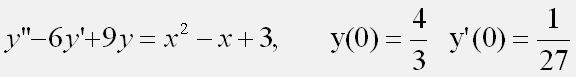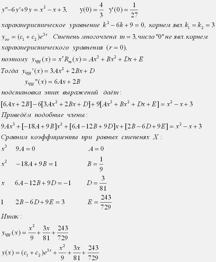 2) У вас получился один корень, но кратности два, т.е. k1=k2=3, тогда решение однородного уравнения будет иметь вид: yo=(C1+C2x)e^(3x), т.е. экспонента умножается на многочлен, степень которого на единицу меньше, чем кратность корня.