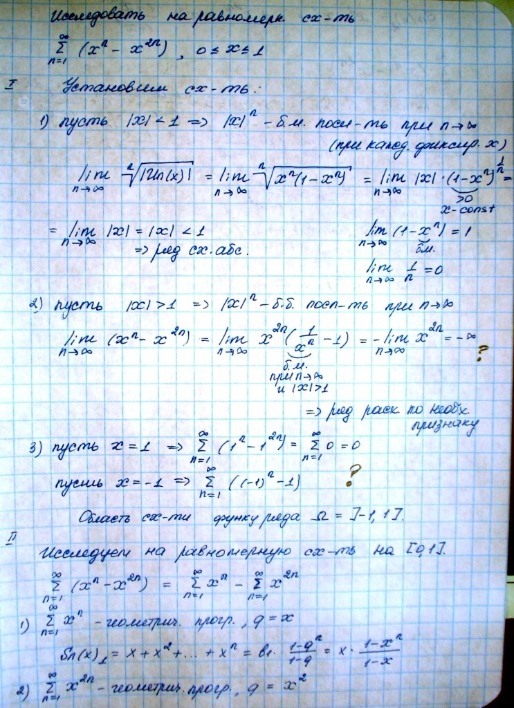 Нужно исследовать на равномерную сх-ть: сумма от n=1 до оо (x^(n) - x^(2n)), 0<=x<=1.