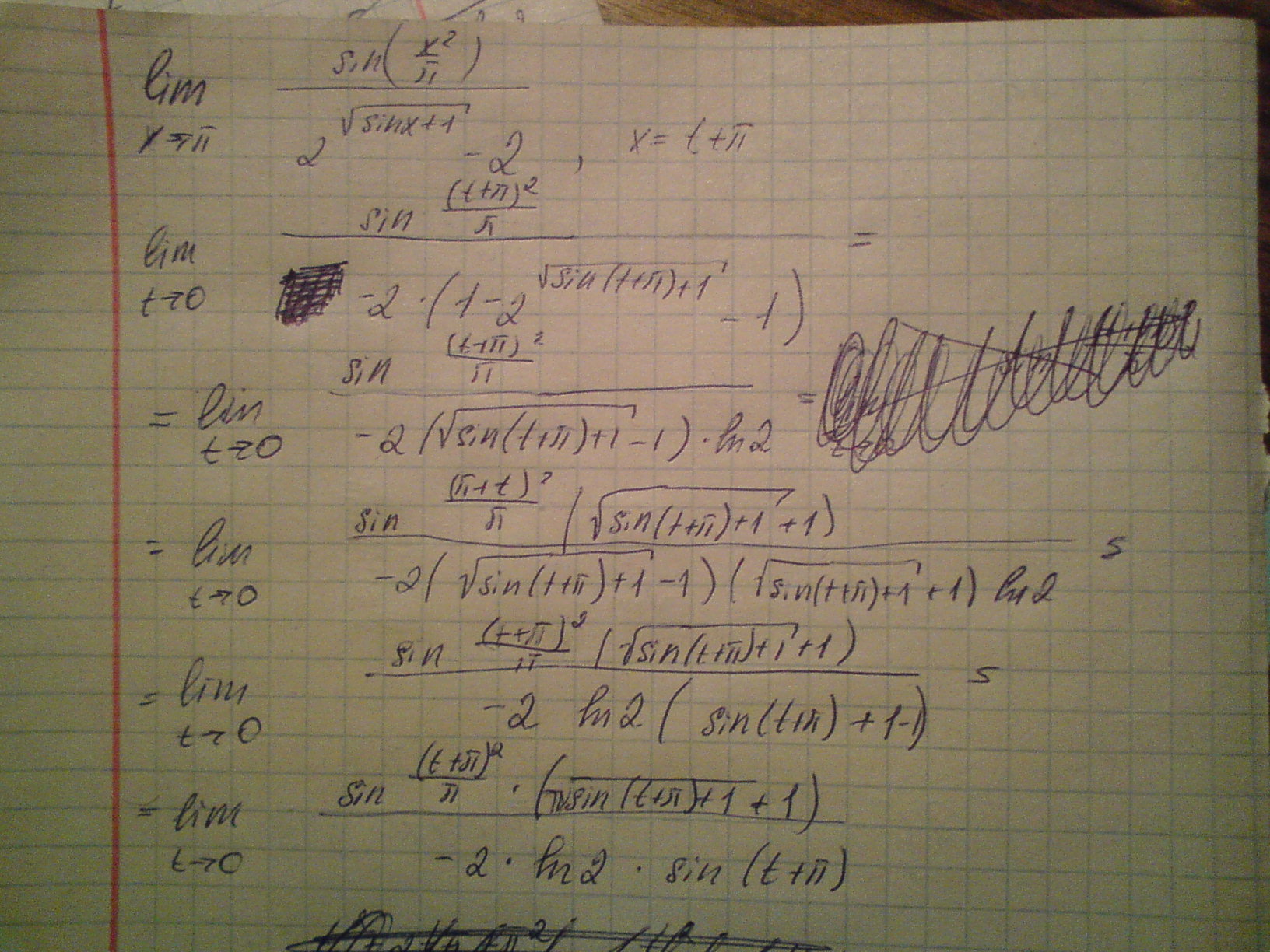 Полная версия: (x->pi) lim(x*x/pi) / (2^sqrt(sinx +1) - 2) > Пределы