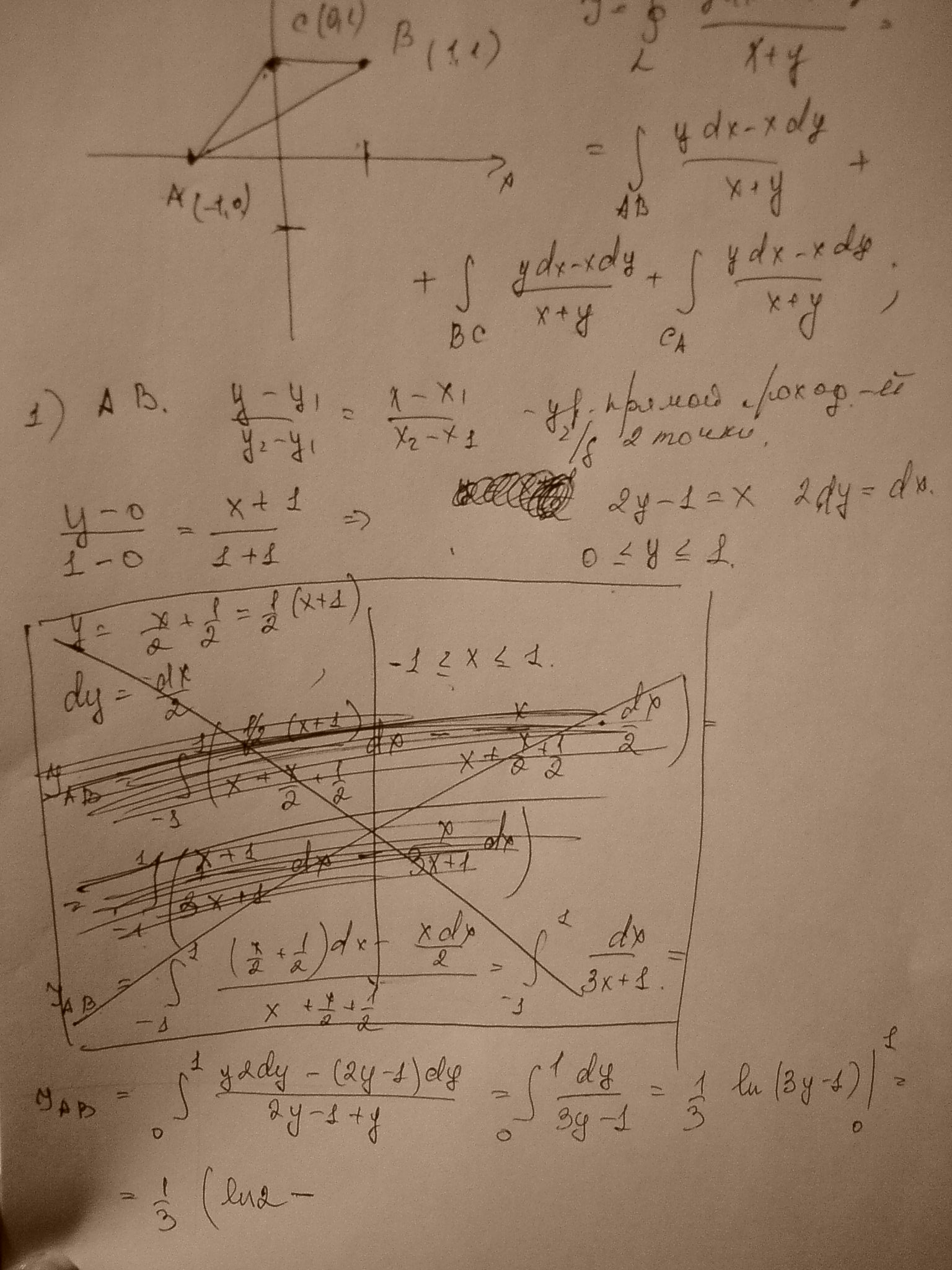 int(AB){(ydx-xdy)/(x+y)}=int(-1;1){((x/2+1/2)dx-xdx/2)/(x/2+1/2+x)}=(1/2)int(-1;1){dx/(3x/2+1/2)}