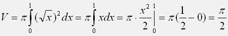 Решение: Так как вращение фигуры происходит вокруг оси ОХ, то объем тела определяем по формуле,