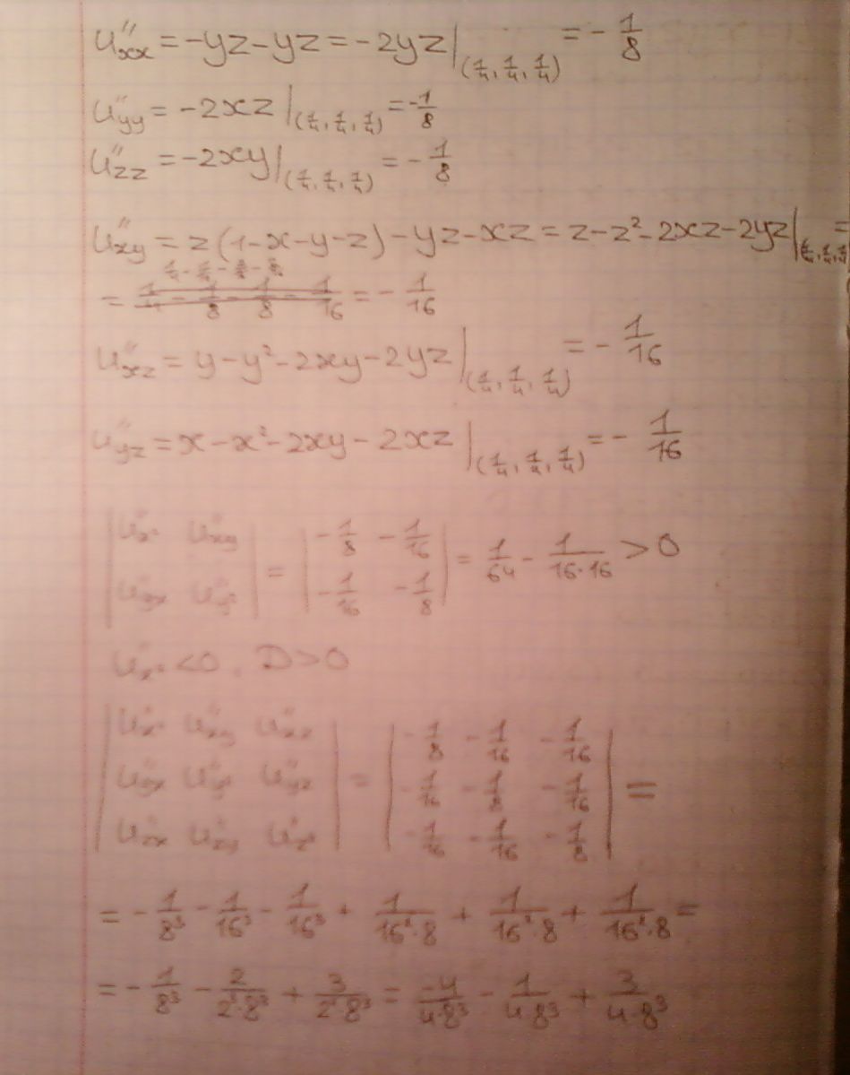 у меня получается, что экстремума не сущ., а он должен быть в т.(1/4,1/4,1/4)