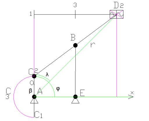 Доброго времени суток, попытаюсь обьяснить суть проблемы. Есть лямбда механизм Чебышева (рисунок в приложении). Точки A и E закреплены, точка D совершает поступательные движение (от 2 до 1, как показано на рисунке), в следствии чего точка C поворачивает из положения 2, в положение 1. Каждая из этих точек имеет свои координаты в любом положении (Xd;Yd) и (Xc;Yc) соответственно. Нужно найти зависимость координат точки C от координат точки D. (Входные переменные (Xd;Yd), выходные (Xc;Yc)).