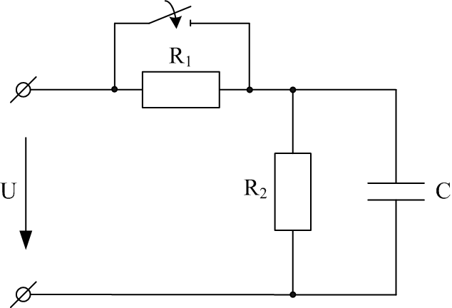 Параметры элементов цепи: U=10 В, R1=R2=10 Ом, С=10 мкФ.