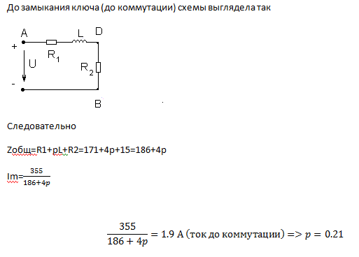 Единственное, что я не указал, это амплитуда входного напряжения = 2187. Никакой информации о времени замыкания ключа я не нашёл. На практике мы искали производную от найденного выражения, потом в момент времени t=0 подставляли 0 и искали постоянные интегрирования. Что то в этом роде.