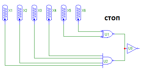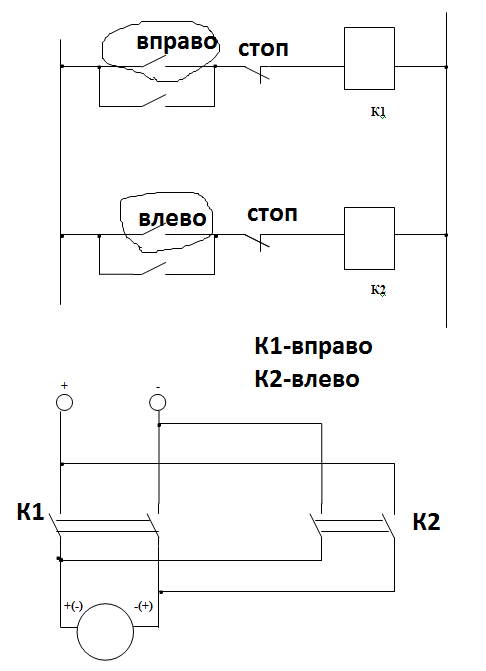 Здравствуйте. прошу помочь разобраться в одном вопросе. препод дал задание разработать цифровую систему управления тележкой.Я составил три схемы (те, что выложены - просто изображение) для движения тележки вправо, влево и стоп. Есть также реле, т.е. если включено К1. то тележка движется вправо, если к2 - то влево. Непонятно, как собрать схему воедино??? Пожалуйста помогите!