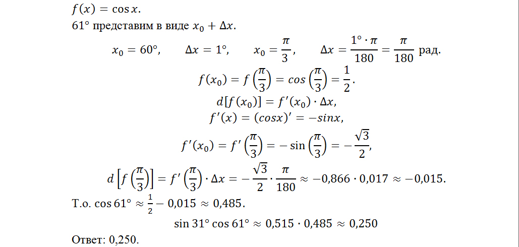 Вычислите приближенное значение числа sin31°cos61°, используя приближение полного приращения функции ее дифференциалом. Укажите результат с точностью до трех знаков после запятой.