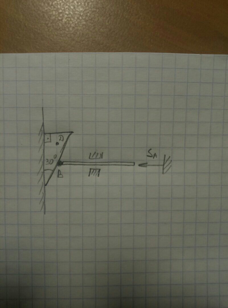 Добрый день,нужна помощь.Как можно найти скорость точки Д ,зная скорость точки В и углы.( Прямоугольный треугольник - клин,совершает поступательное движение,стержень- толкатель)
