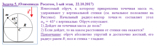 Мне кажется, что первоначально точечная масса m будет двигаться вертикально вниз с ускорением g. В момент, когда тело будет находиться на расстоянии `R(1-sqrt2)` от горизонтальной стенки, произойдет упругий удар, и тело начнет двигаться вертикально вверх до первоначального положения и т.д.