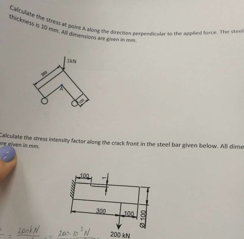 1) Рассчитать напряжение в точке А вдоль направления, перпендикулярного к приложенной нагрузке. Толщина стальной пластины 10 мм. Все размеры на картинке дыны в мм.