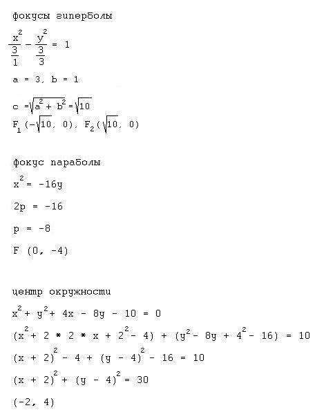 нашёл центр окружности, фокусы гиперболы и фокус параболы