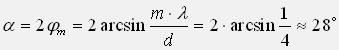 Задача: Постоянная дифракционной решётки в n=4 раз больше длинысветовой волны монохроматического света, нормально падающего на её поверхность. Определить угол а между двумя первыми симметричными дифракционными максимумами.