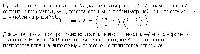 Пусть U - линейное пространство M2x2 матриц размерности 2х2. Подмножество V состоит из всех матриц X принадлежащих U, перестановочных с любой матрицей из U, то есть XY=YX для любой матрицы Y принадлежащей U. Пололжим W = <(3 1 -- 1ая строка; 3 1 -- 2ая строка), (1 1 -- 1ая строка; 3 -1 -- 2ая строка)>. Докажите, что V - подпространство и задайте его системой линейных однородных уравнений. Найдите ФСР этой системы и (с помощью ФСР) базис этого подпространства. Найдите сумму и пересечение подпространств V и W.