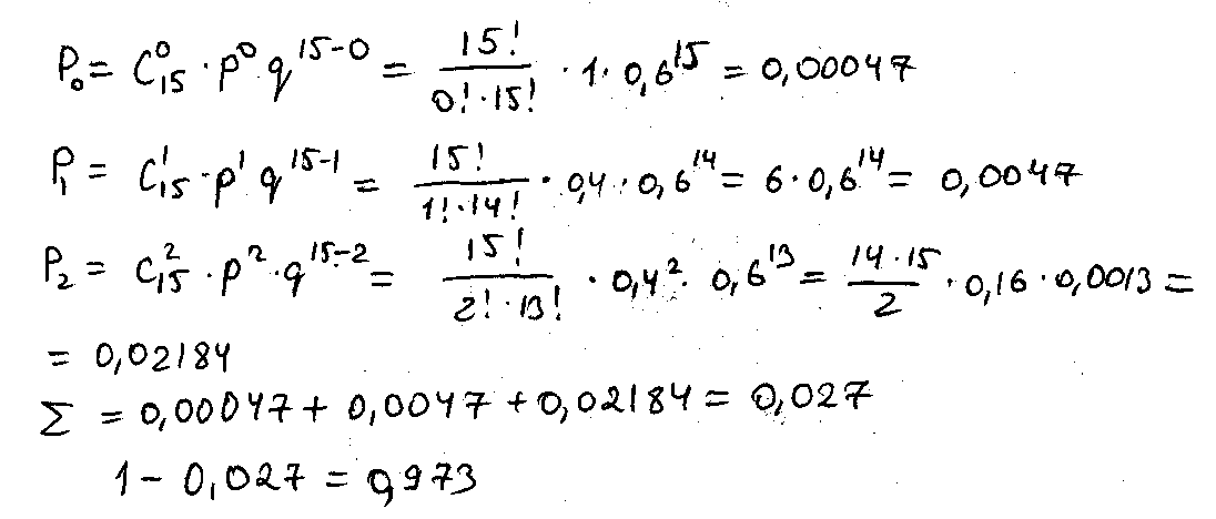 P = C15^3*p^3*q^(15-3) = 455*0.4^3*0.6^12=455*0.064*0.00217=